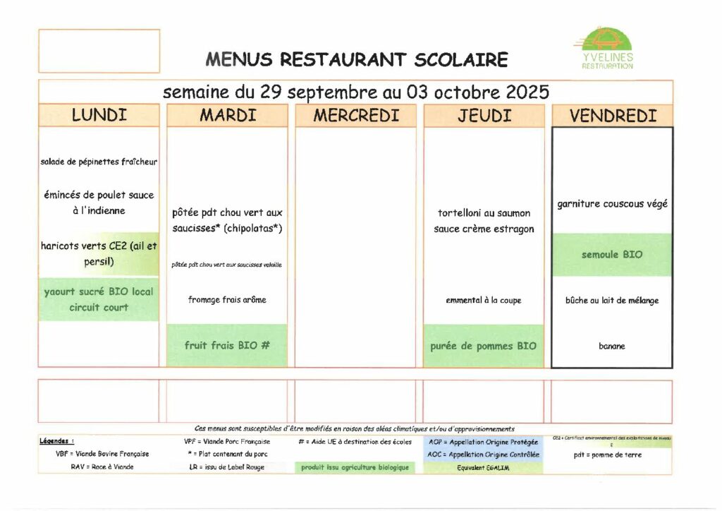 Menus cantine semaine du 29 septembre au 03 octobre 2025 Posté le26 septembre 202529 juillet 2025Auteurvalerie