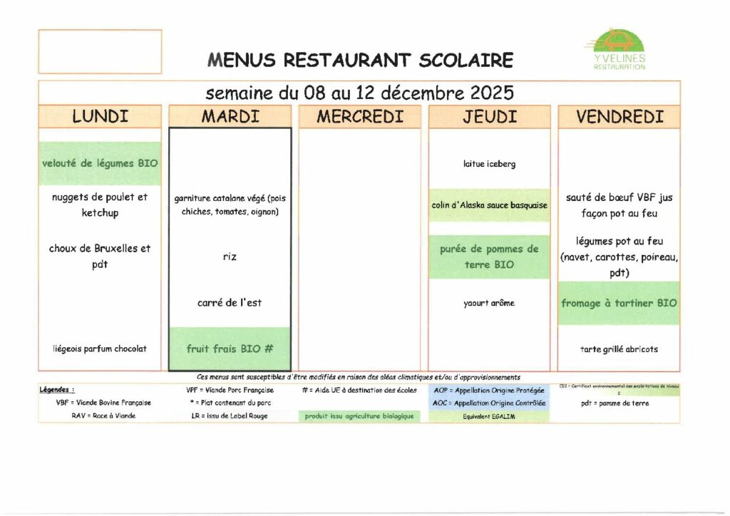 Menus Cantine Semaine du 08 au 12 décembre 2025