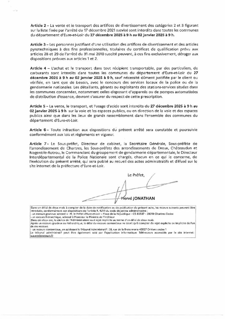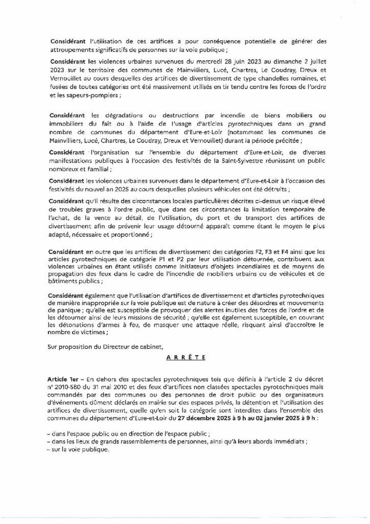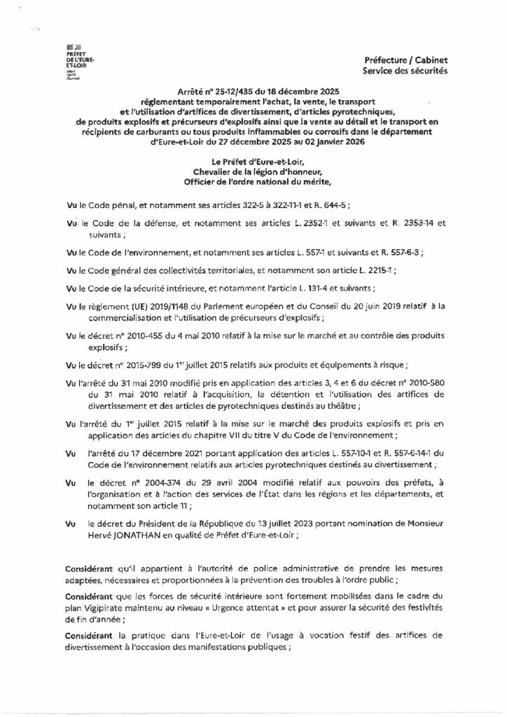 Réglementation temporairement l’achat, la vente, le transport et l’utilisation d’artifices de divertissement, d’articles pyrotechniques, de produits explosifs et précurseurs d’explosifs ainsi que la vente au détail et le transport en récipients de carburants ou tous produits inflammables ou corrosifs dans le département d’Eure et Loir