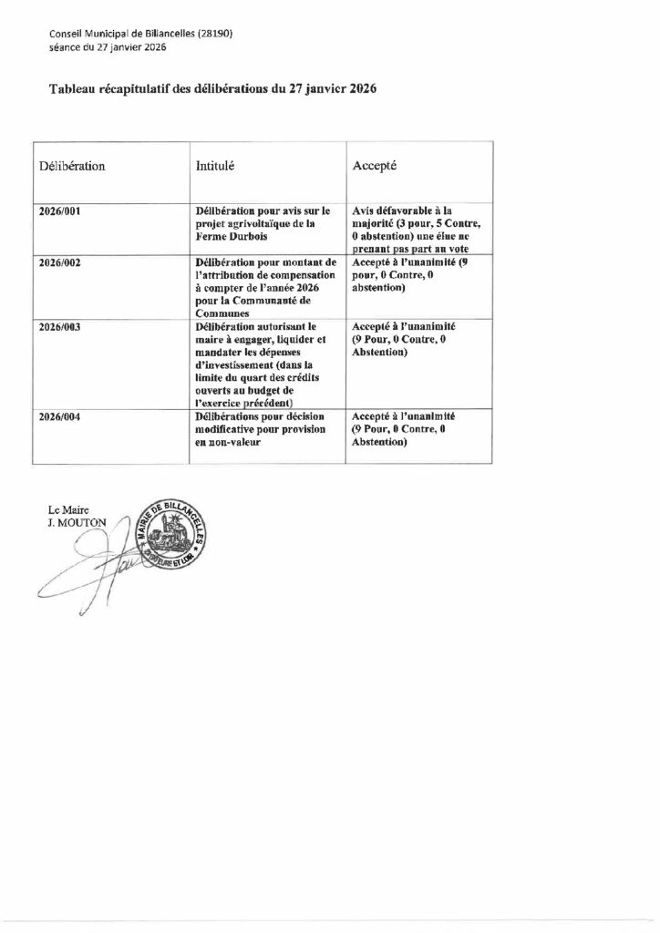 Maison »Infos»Tableau des délibérations du mardi 27 janvier 2026