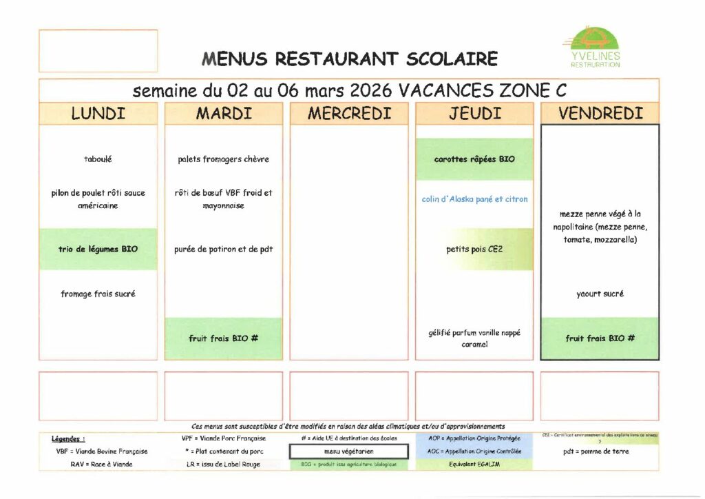 Menus restaurant scolaire semaine du 02 au 06 mars 2026
