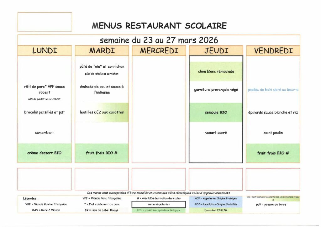 Maison »Infos»Menus Restaurant Scolaire semaine du 23 au 27 mars 2026