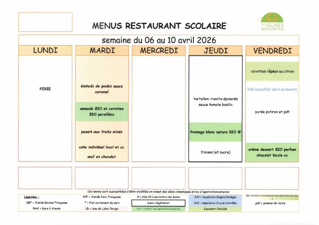 Maison »Infos»Menus Cantine semaine du 06 avril au 10 avril 2026