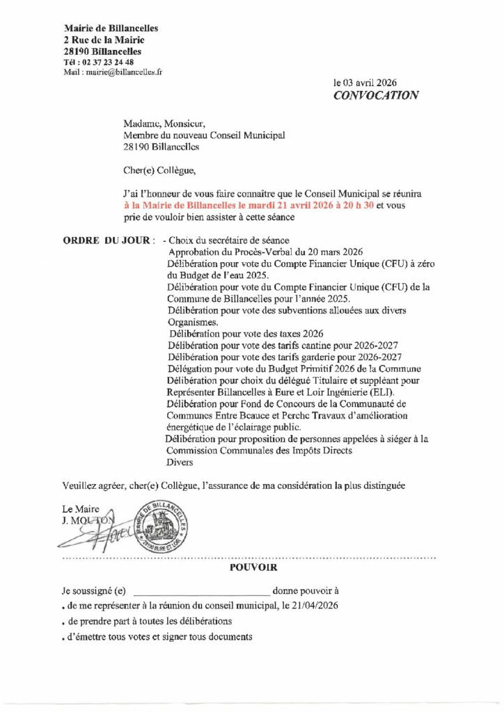 le mardi 21 avril 2026 à 20 h 30 à la Mairie de Billancelles