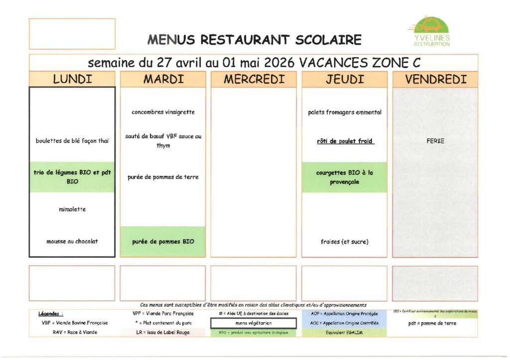 Menus Cantine semaine du 27 avril au 01 mai 2026